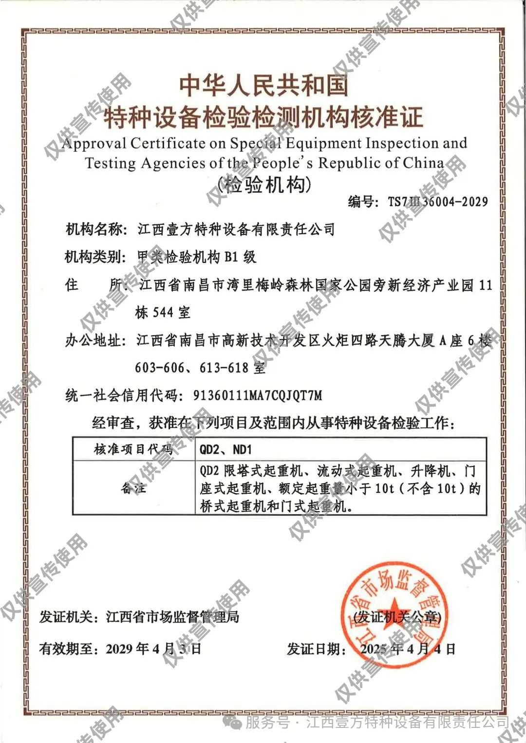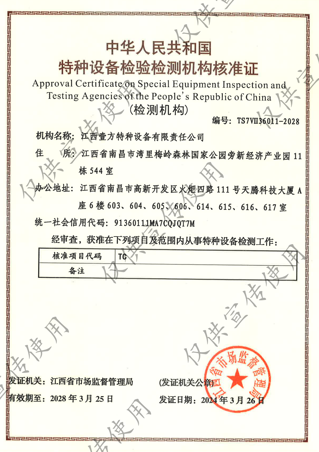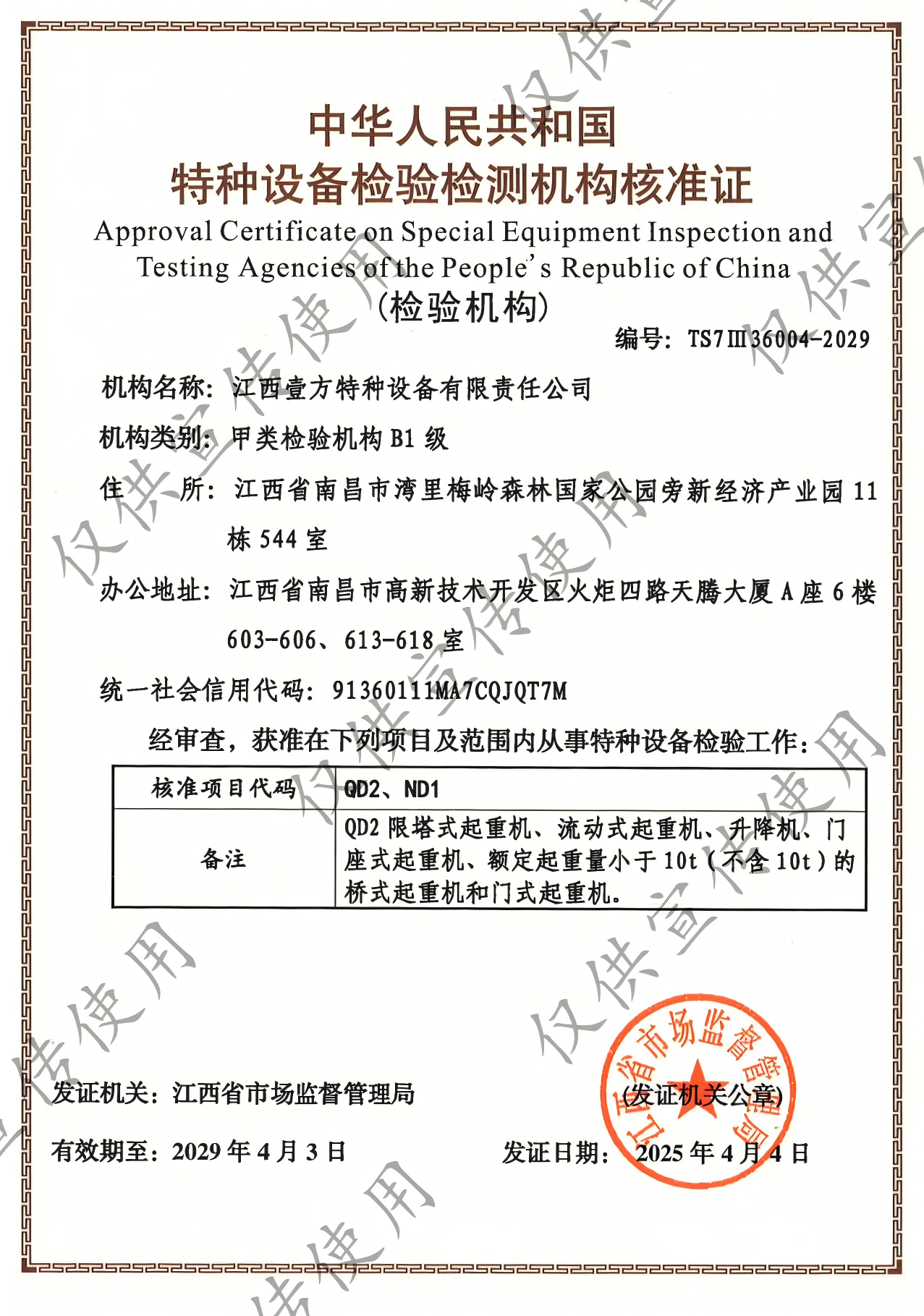 成立于2021年11月29日,注册资本600万元,地址:江西省南昌市湾里梅岭森林国家公园旁新经济产业园11栋544室,统一社会信用代码:91360111MA7CQJQT7M。主要从事特种设备检验检测、检验检测服务、电梯安全评估、工程监理服务:教育咨询、企业管理咨询、检验检测设备研发、技术咨询、技术服务的独立法人单位。公司现有员工180人,包括高级工程师3人、工程师18人、助理工程师8人、电梯检验检测师15人、电梯检验检测员66人,并配备528台(套)先进检验检测仪器设备。